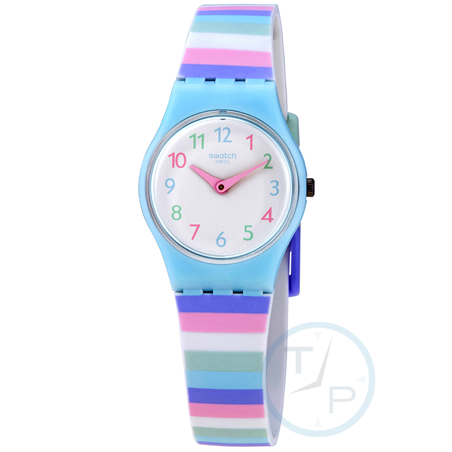 Matte blue plastic case with a striped green, blue, purple and pink silicone strap. Fixed blue plastic bezel. White dial with pink hands and multi-color Arabic numeral hour markers. Dial Type: Analog. Quartz movement. Plexiglass crystal. Pull / push crown. Translucent case back. Round case shape. Case size: 25 mm. Case thickness: 7 mm. Band width: 12 mm. Tang clasp. Water resistant at 30 meters / 100 feet. Functions: hour, minute. Casual watch style. Swatch Pastep Quartz White Dial Ladies Watch LL121.
