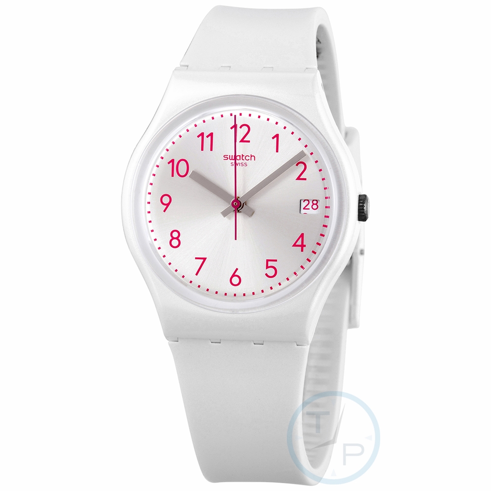 White plastic case with a white silicone strap. Fixed white plastic bezel. Light grey dial with silver-tone hands and Arabic numeral hour markers. Minute markers around the outer rim. Dial Type: Analog. Date display at the 3 o'clock position. Quartz movement. Plexiglass crystal. Pull / push crown. Solid case back. Round case shape. Case size: 34 mm. Case thickness: 8 mm. Band width: 16 mm. Tang clasp. Water resistant at 30 meters / 100 feet. Functions: date, hour, minute, second. Casual watch style. Watch label: Swiss Made. Swatch PEARLAZING Quartz Ladies Watch GW411.