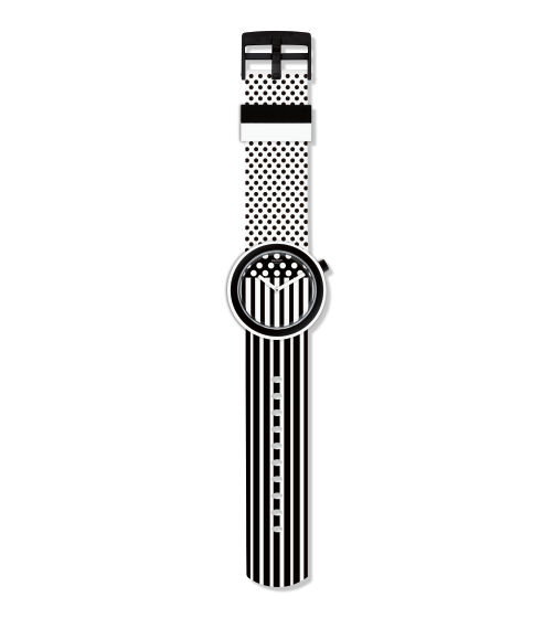 Black plastic case with a black and white (stripe and polka dot) silicone strap. Fixed white plastic bezel with an inlaid black ring. Black and white dial with white hands. No markers. Dial Type: Analog. Luminescent hands. Quartz movement. Acrylic crystal. Pull / push crown. Solid case back. Round case shape. Case size: 45 mm. Case thickness: 11 mm. Band width: 20 mm. Tang clasp. Water resistant at 30 meters / 100 feet. Functions: hour, minute. Additional Info: black and white stripes and polka dots on dial and band. Fashion watch style. Swatch Pop Dancing Black and White Dial Ladies Watch PNW101.