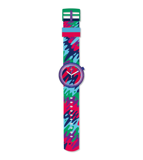 Purple (transparent) plastic case with a multi-colored silicone strap. Fixed purple (transparent) plastic bezel. Multi-colored dial with white hands. No markers. Dial Type: Analog. Quartz movement. Plexiglass crystal. Pull / push crown. Solid case back. Round case shape. Case size: 45 mm. Case thickness: 11 mm. Band width: 20 mm. Tang clasp. Water resistant at 30 meters / 100 feet. Functions: hour, minute, second. Popthusiasm Series. Casual watch style. Swatch Popthusiasm Quartz Multi-Colored Dial Unisex Watch PNP101.