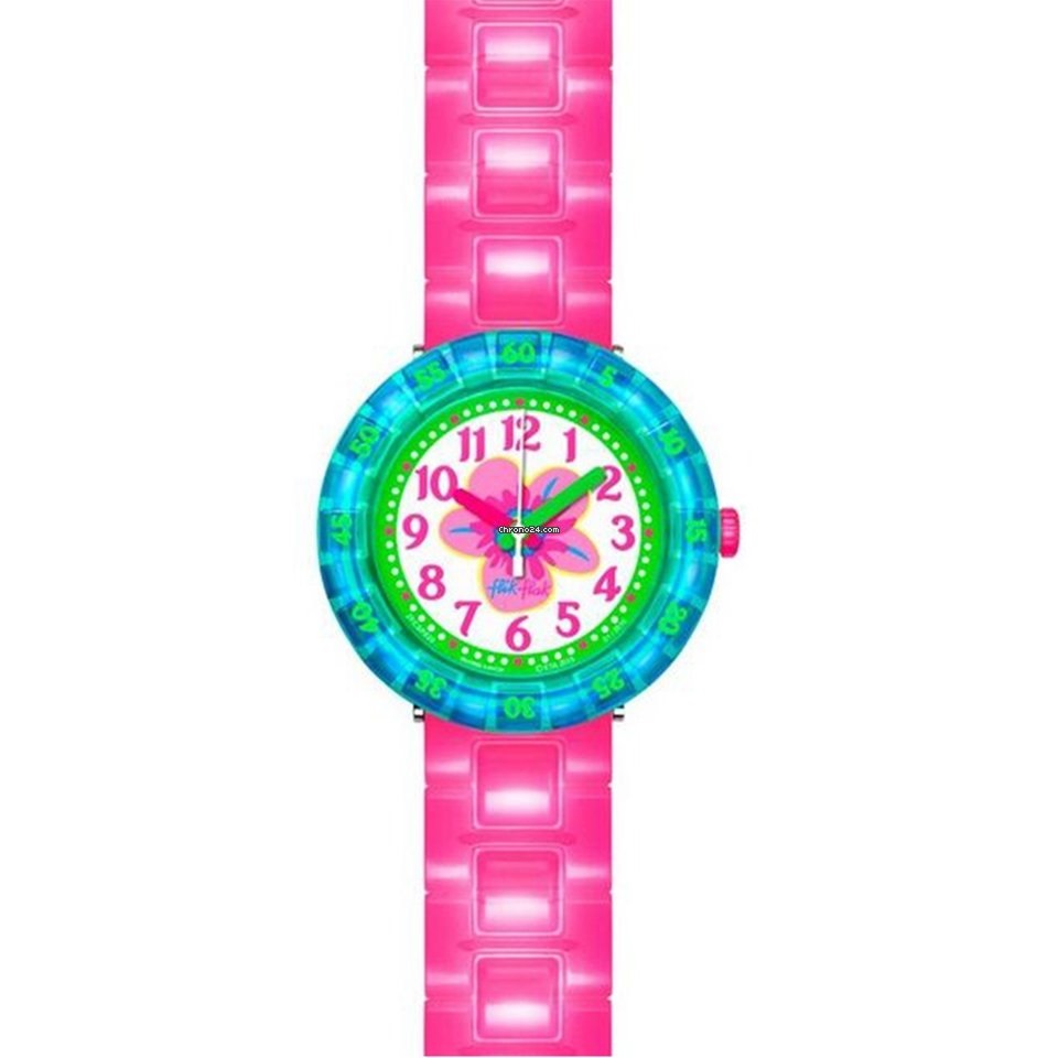 Plastic case with a plastic pink band. White dial with green-pink hands and Arabic numeral hour markers. Minute markers around the outer rim. Dial Type: Analog. Quartz movement. Pull / push crown. Solid case back. Round case shape, case size: 36.7 mm x 35 mm. Buckle clasp. Water resistant at 30 meters / 100 feet. Functions: hour, minute, second. Casual watch style. Swatch Quartz White Dial Kids Chewy Pink Watch ZFCSP028.