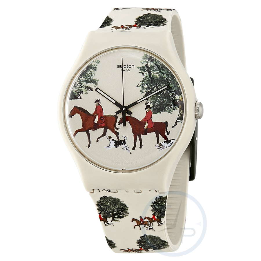 Cream plastic case with a cream (hound hunt) silicone strap. Fixed translucent plastic bezel. Cream dial with luminous black hands. No markers. Dial Type: Analog. Luminescent hands. Quartz movement. Plexiglass crystal. Pull / push crown. Solid case back. Round case shape. Case size: 41 mm. Case thickness: 9.85 mm. Band width: 20 mm. Tang clasp. Water resistant at 30 meters / 100 feet. Functions: hour, minute, second. Casual watch style. Swatch Red Jacket Cream Dial Unisex Watch SUOT103.