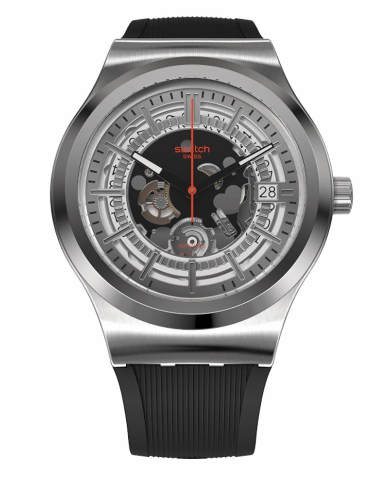 Grey-plated stainless steel case with a black rubber strap. Fixed grey-plated bezel. Grey (skeleton) dial with luminous black hands and index hour markers. Minute markers around the outer rim. Dial Type: Analog. Luminescent hands. Date display at the 3 o'clock position. Automatic movement. Pull / push crown. Transparent case back. Round case shape. Case size: 42 mm. Case thickness: 13.8 mm. Band width: 20 mm. Tang clasp. Water resistant at 30 meters / 100 feet. Functions: date, hour, minute, second. Sistem Through Again Series. Casual watch style. Swatch Sistem Through Again Automatic Grey Dial Mens Watch YIS431.