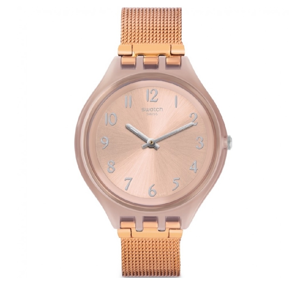 . Pink plastic case with a rose gold-tone stainless steel bracelet. Fixed pink plastic bezel. Pink dial with silver-tone hands and Arabic numeral hour markers. Dial Type: Analog. Quartz movement. Scratch resistant plastic crystal. Pull / push crown. Round case shape, case size: 40 mm. Fold over clasp with a safety release. Water resistant at 30 meters / 100 feet. Functions: hour, minute. Fashion watch style. Swatch Skinchic Quartz Pink Dial Ladies Watch SVUP100M.