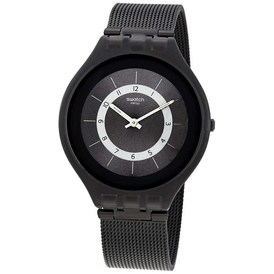 Black plastic case with a black PVD stainless steel milanese bracelet. Fixed black plastic bezel. Black and silver dial with luminous silver-tone hands and Arabic numeral / index hour markers. Dial Type: Analog. Quartz movement. Plexiglass crystal. Pull / push crown. Solid case back. Round case shape. Case size: 40 mm. Case thickness: 5.65 mm. Band width: 18 mm. Fold over slip through clasp. Water resistant at 30 meters / 100 feet. Functions: hour, minute. Skinknight Series. Casual watch style. Swatch Skinknight Black and Silver Dial Unisex Watch SVUB105M.