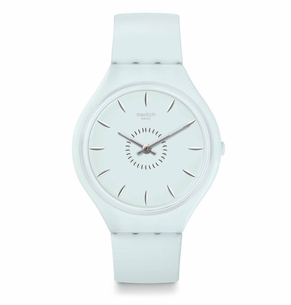 Green plastic case with a green silicone strap. Fixed green plastic bezel. Green dial with luminous silver-tone hands and index hour markers. Dial Type: Analog. Luminescent hands. Quartz movement. Scratch resistant plexiglass crystal. Pull / push crown. Solid case back. Round case shape. Case size: 37 mm. Case thickness: 5 mm. Band width: 16 mm. Tang clasp. Water resistant at 30 meters / 100 feet. Functions: hour, minute. Casual watch style. Swatch Skinmint Quartz Green Dial Ladies Watch SVOG100.
