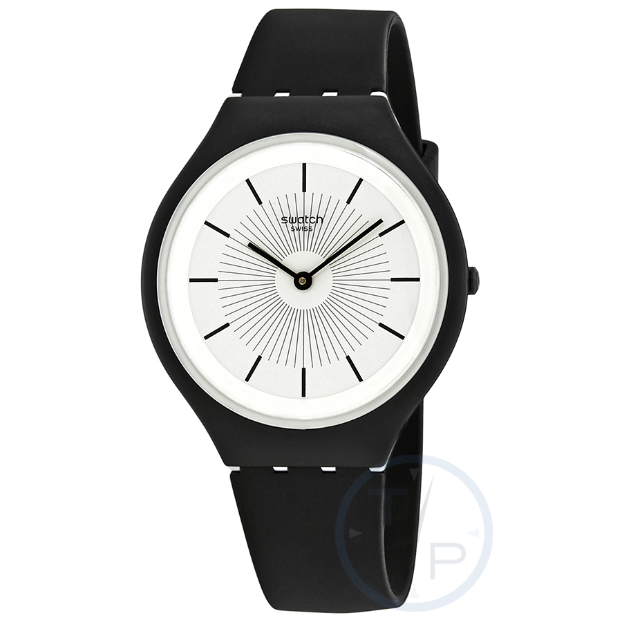 Black plastic case with a black silicone strap. Fixed black plastic bezel. White dial with black hands and index hour markers. Dial Type: Analog. Quartz movement. Scratch resistant mineral crystal. Pull / push crown. Solid case back. Round case shape, case size: 40 mm, case thickness: 5.70 mm. Buckle clasp. Water resistant at 30 meters / 100 feet. Functions: hour, minute. Casual watch style. Swatch Skinnoir White Dial Unisex Plastic Watch SVUB100.