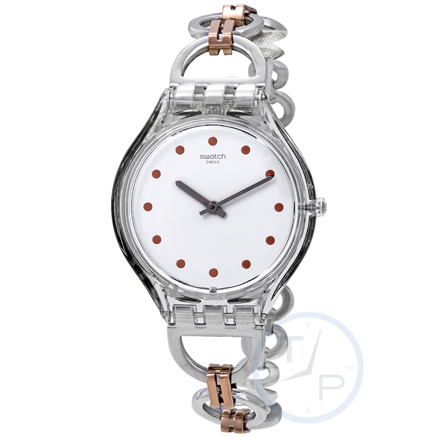 Translucent plastic case with a silver-tone/rose gold-tone stainless steel chain two-tone bracelet. Fixed bezel. White dial with silver-tone hands and index hour markers. Dial Type: Analog. Quartz movement. Transparent case back. Round case shape, case size: 36.8 mm, case thickness: 5.4 mm. Jewelry clasp. Water resistant at 30 meters / 100 feet. Functions: hour, minute. Casual watch style. Watch label: Swiss Made. Swatch Skinring White Dial Two-Tone Ladies Watch SVOK102G.