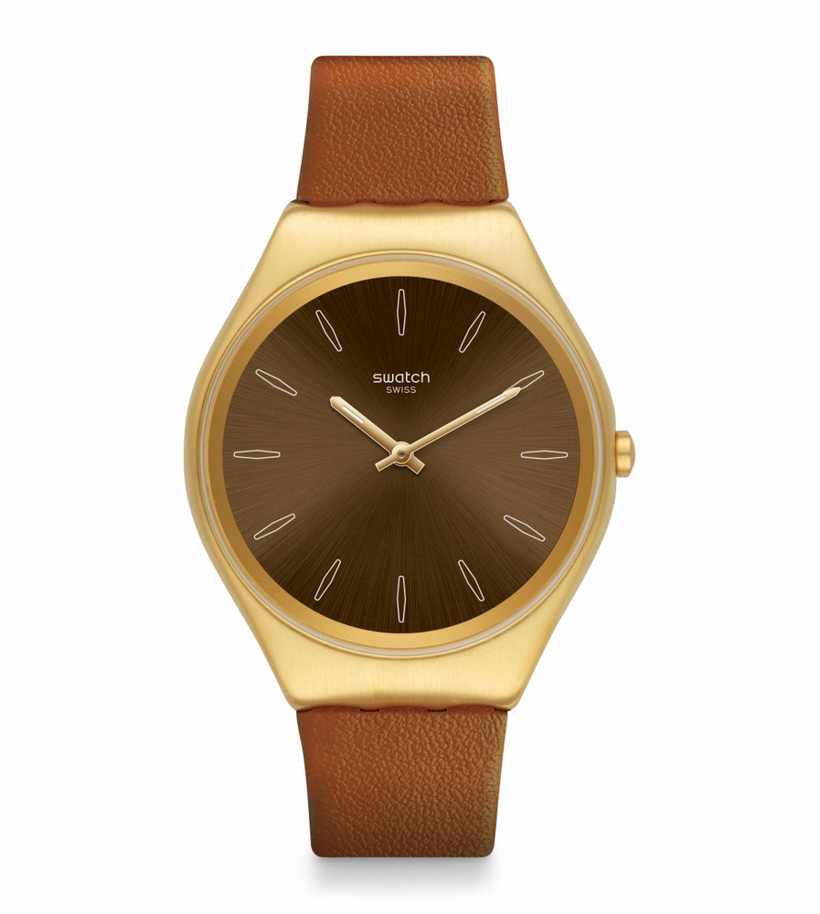 Gold-tone stainless steel case with a brown leather strap. Fixed gold-tone stainless steel bezel. Brown dial with gold-tone hands and almond shaped index hour markers. Dial Type: Analog. Quartz movement. Pull / push crown. Solid case back. Round case shape, case size: 38 mm. Buckle clasp. Water resistant at 30 meters / 100 feet. Functions: hour, minute. Fashion watch style. Swatch Skinsand Quartz Brown Dial Unisex Watch SYXG104.