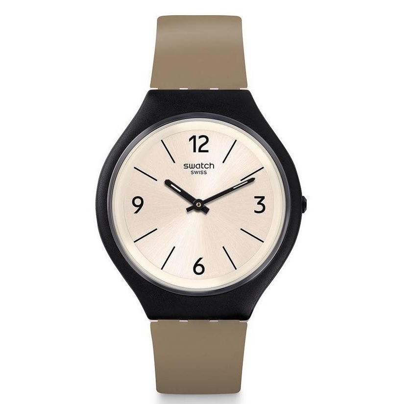 Black plastic case with a brown leather strap. Fixed bezel. Black hands and index and Arabic numeral markers at the 3, 6, 9 and 12 o'clock positions hour markers. Dial Type: Analog. Quartz movement. Scratch resistant plastic crystal. Pull / push crown. Solid case back. Round case shape, case size: 40 mm. Buckle clasp. Water resistant at 30 meters / 100 feet. Functions: hour, minute. Fashion watch style. Swatch Skinsand Quartz Mens Watch SVUB101.