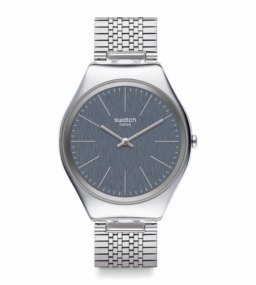 Silver-tone stainless steel case and bracelet. Fixed bezel. Blue dial with silver-tone hands and index hour markers. Minute markers around the outer rim. Dial Type: Analog. Quartz movement. Pull / push crown. Solid case back. Round case shape, case size: 38 mm. Fold over clasp with a safety release. Water resistant at 30 meters / 100 feet. Functions: hour, minute. Casual watch style. Swatch Skinsportchic Blue Dial Unisex Watch SYXS122GG.