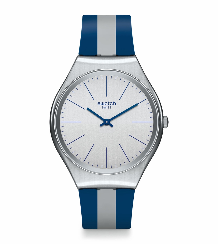 Silver-tone stainless steel case with a two-tone (blue and grey) silicone strap. Fixed silver-tone stainless steel bezel. Grey dial with blue hands and index hour markers. Minute markers around the outer rim. Dial Type: Analog. Quartz movement. Scratch resistant plexiglass crystal. Pull / push crown. Solid case back. Round case shape, case size: 38 mm. Buckle clasp. Water resistant at 30 meters / 100 feet. Functions: hour, minute. Casual watch style. Swatch Skinspring Unisex Watch SYXS107.