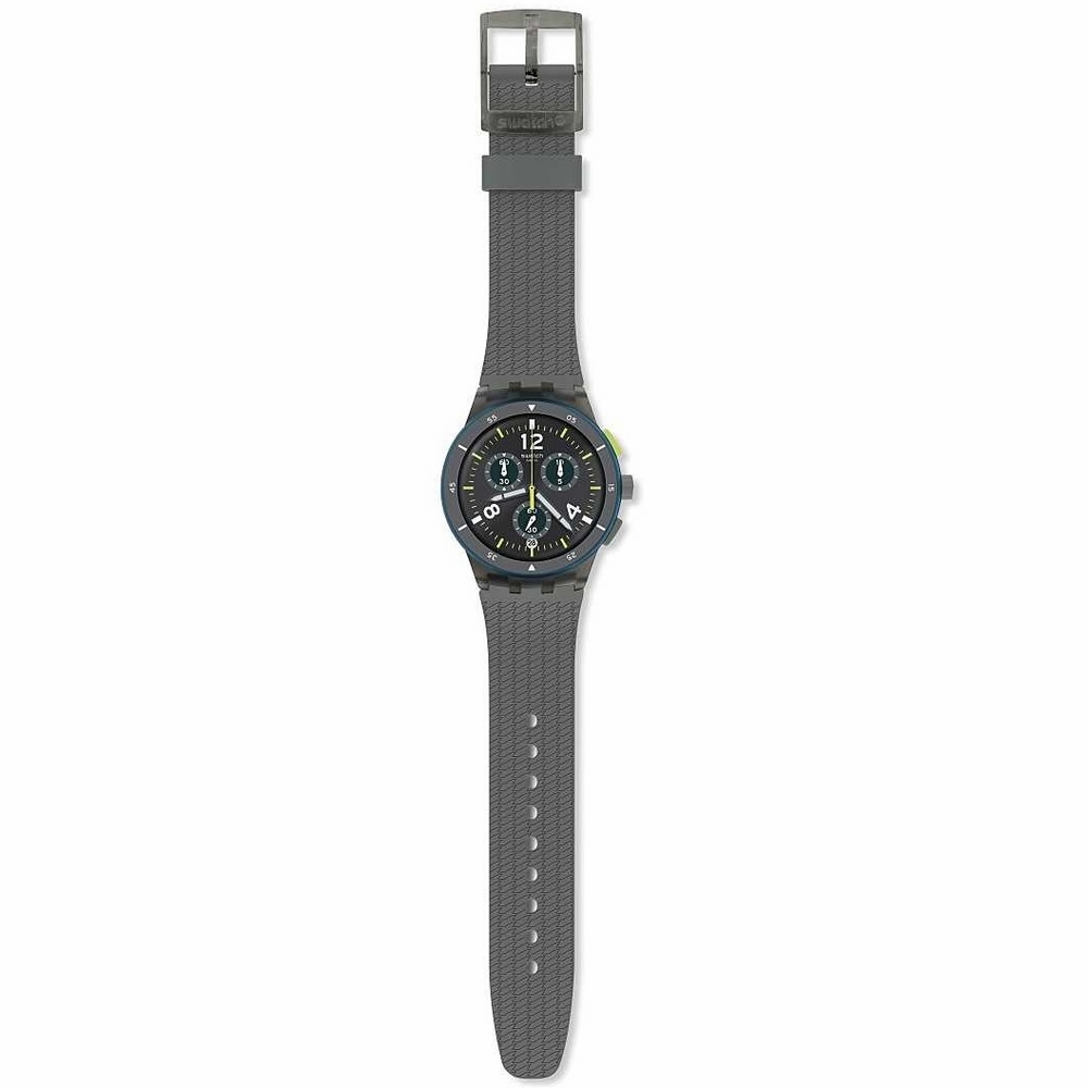 Gray plastic case with a gray silicone strap. Fixed grey plastic bezel with a blue outer ring. Grey dial with luminous black hands and index hour markers. Arabic numerals appear at the 4, 8 and 12 o'clock positions. Minute markers around the outer rim. Dial Type: Analog. Luminescent hands and markers. Date display at the 6 o'clock position. Chronograph - three sub-dials displaying: 60 second, 60 minute and 1/10th of a second. Quartz movement. Plexiglass crystal. Pull / push crown. Translucent case back. Round case shape. Case size: 42 mm. Case thickness: 14.03 mm. Band width: 20 mm. Tang clasp. Water resistant at 30 meters / 100 feet. Functions: chronograph, date, hour, minute, second. Sport watch style. Swatch Sportire Chronograph Quartz Grey Dial Mens Watch SUSM407.