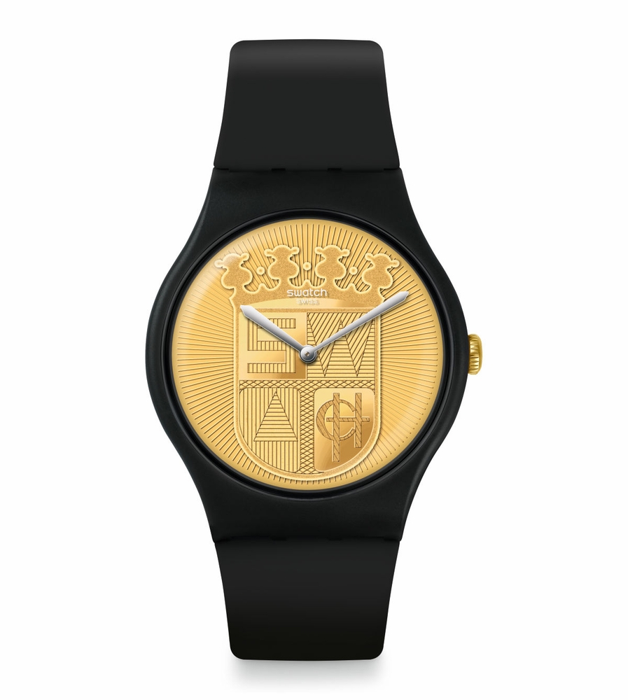 Black plastic case with a black silicone strap. Fixed black plastic bezel. Gold (Swatch Coat of Arms) dial with silver-tone hands. No markers. Dial Type: Analog. Quartz movement. Scratch resistant plastic crystal. Pull / push crown. Solid case back. Round case shape. Case size: 41 mm, case thickness: 8.75 mm. Band width: 19.7 mm. Tang clasp. Water resistant at 30 meters / 100 feet. Functions: hour, minute. Casual watch style. Swatch Super Sir Gold Dial Black Silicone Mens Watch SUOB170.