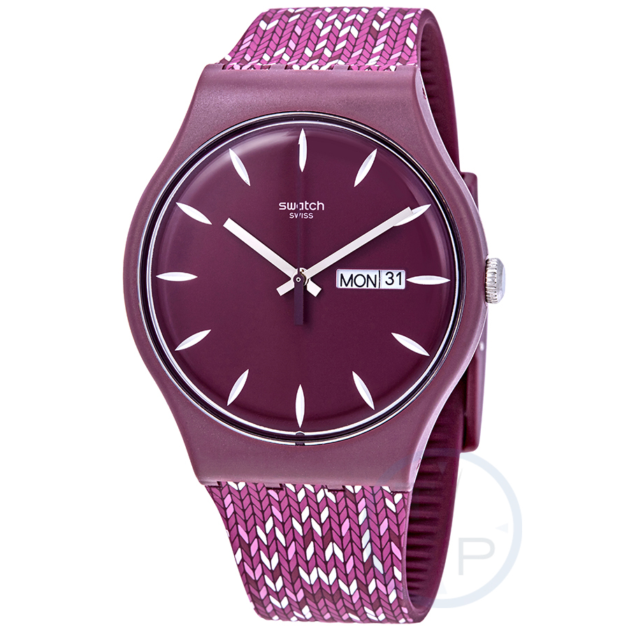 Purple plastic case with a purple/white/pink silicone strap. Fixed purple bezel. Purple dial with silver-tone hands and index hour markers. Dial Type: Analog. Day of the week and date display at the 3 o'clock position. Quartz movement. Solid case back. Round case shape, case size: 41 mm, case thickness: 9.85 mm. Buckle clasp. Water resistant at 30 meters / 100 feet. Functions: date, day, hour, minute, second. Casual watch style. Watch label: Swiss Made. Swatch TricoPurp Purple Dial Mens Watch SUOV705.