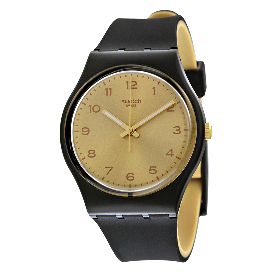 Black plastic case with a black rubber strap. Fixed transalucent plastic bezel. Gold dial with luminous gold-tone hands and Arabic numeral hour markers. Minute markers around the outer rim. Dial Type: Analog. Luminescent hands. Quartz movement. Scratch resistant mineral crystal. Pull / push crown. Solid case back. Round case shape. Case size: 33 mm. Case thickness: 8 mm. Band width: 20 mm. Tang clasp. Water resistant at 50 meters / 165 feet. Functions: hour, minute, second. Casual watch style. Swatch Originals Gold Dial Black Rubber Ladies Watch GB288.
