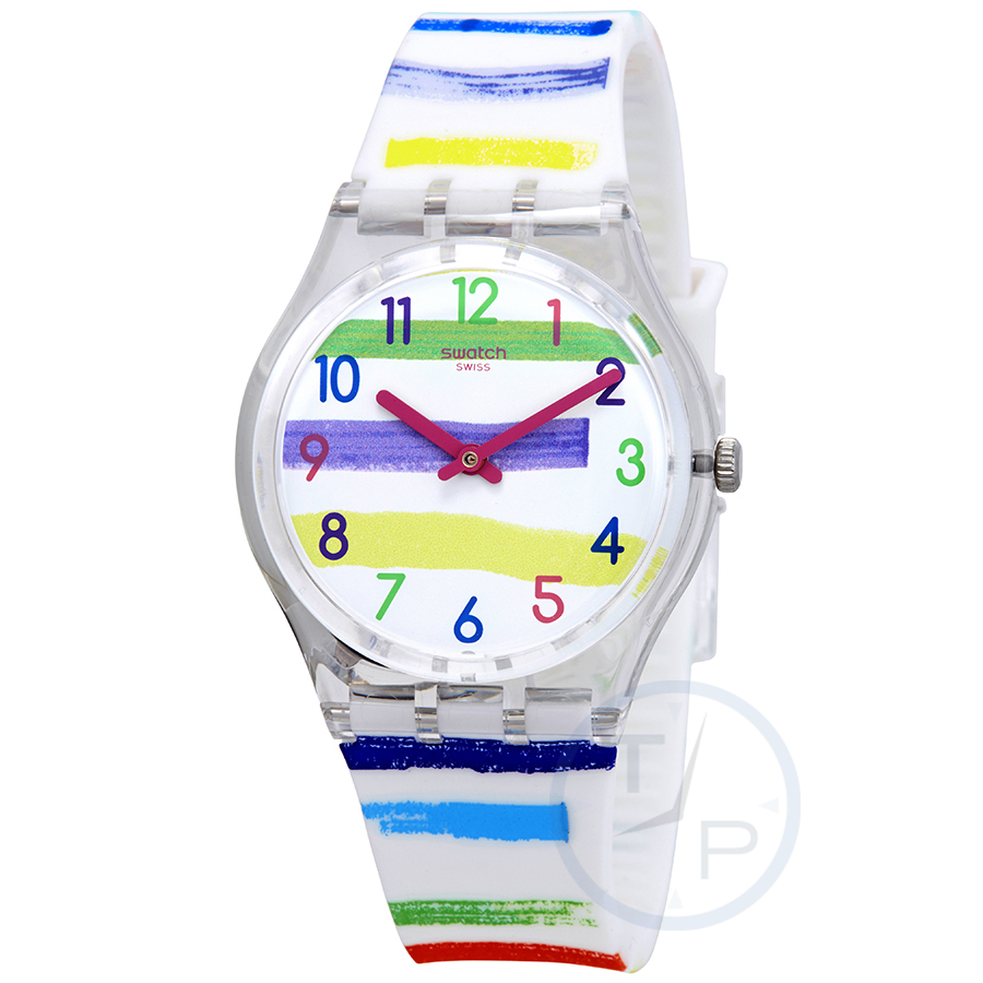 Transparent plastic case with a white silicone strap featuring multi-colored brush strokes. Fixed transparent plastic bezel. White dial with red hands and Arabic numeral hour markers. Dial Type: Analog. Quartz movement. Plexiglass crystal. Pull / push crown. Transparent case back. Round case shape. Case size: 34 mm. Case thickness: 8.75 mm. Band width: 17 mm. Band length: 8.25 inches. Tang clasp. Water resistant at 30 meters / 100 feet. Functions: hour, minute. Casual watch style. Swatch Colorland White Dial Ladies Watch GE254.