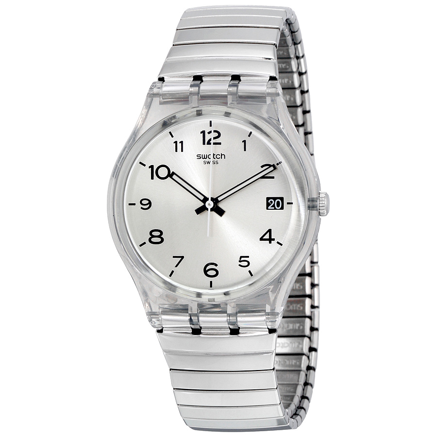 Translucent plastic case with a stainless steel expandable bracelet. Fixed translucent plastic bezel. Silver dial with luminous hands and Arabic numeral hour markers. Dial Type: Analog. Date display at the 3 o'clock position. Quartz movement. Plexiglass crystal. Pull / push crown. Transparent case back. Round case shape. Case size: 34 mm. Case thickness: 9 mm. Band width: 16 mm. Water resistant at 30 meters / 100 feet. Functions: date, hour, minute, second. Silverall Series. Casual watch style. Swatch Silverall Silver Dial Stainless Steel Unisex Watch GM416A.