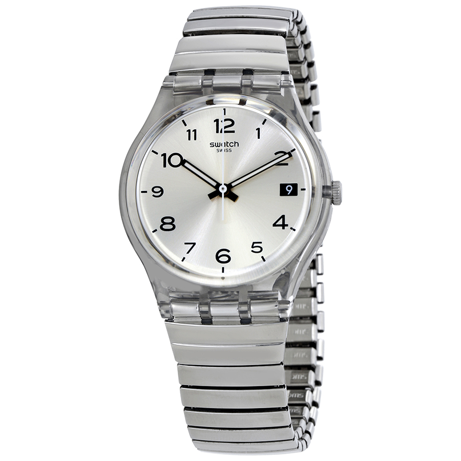 Translucent plastic case with a stainless steel expansion bracelet. Fixed translucent plastic bezel. Silver dial with luminous black hands and Arabic numeral hour markers. Minute markers around the outer rim. Luminescent hands and markers. Date display at the 3 o'clock position. Quartz movement. Scratch resistant plastic crystal. Pull / push crown. Transparent case back. Case size: 32 mm. Case thickness: 9 mm. Round case shape. Band width: 17 mm. Water resistant at 30 meters / 100 feet. Functions: date, hour, minute, second. Casual watch style. Swatch Silverall Silver Dial Ladies Watch.