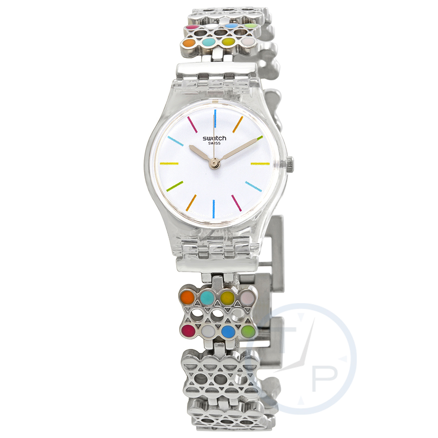Translucent plastic case with a stainless steel bracelet with multi-colored resin accents. Fixed translucent plastic bezel. White dial with silver-tone hands and index hour markers. Dial Type: Analog. Quartz movement. Plastic crystal. Pull / push crown. Transparent case back. Round case shape, case size: 25 mm, case thickness: 7 mm. Jewelry clasp. Water resistant at 30 meters / 100 feet. Functions: hour, minute, second. Casual watch style. Swatch Colorush White Dial Ladies Watch LK368G.
