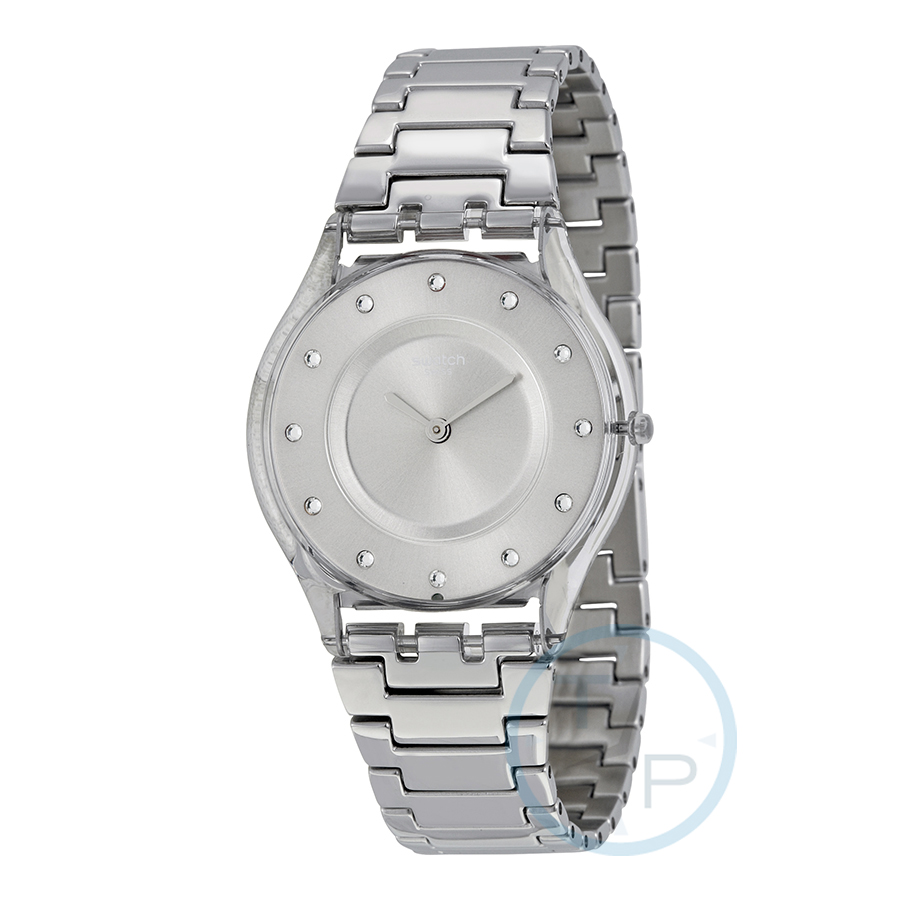 Translucent plastic case with a stainless steel bracelet. Fixed translucent plastic bezel. Silver dial with silver-tone hands and dot hour markers. Dial Type: Analog. Quartz movement. Scratch resistant sapphire crystal. Pull / push crown. Transparent case back. Round case shape. Case dimensions: 38 mm x 34 mm. Case thickness: 4 mm. Band width: 20 mm. Jewelry clasp. Water resistant at 30 meters / 100 feet. Functions: hour, minute. Casual watch style. Swatch Drawer Silver Dial Stainless Steel Ladies Watch SFK393G.