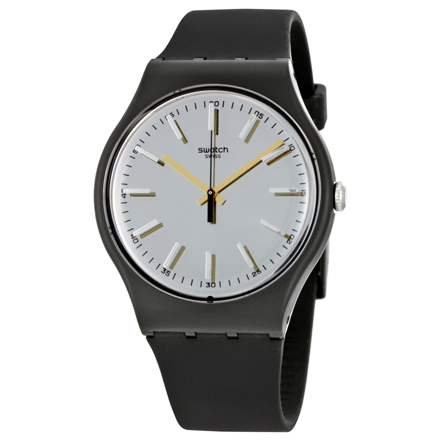 Black plastic case with a black silicone strap. Fixed black plastic bezel. Silver dial with luminous hands and luminous index hour markers. Dial Type: Analog. Quartz movement. Plexiglass crystal. Pull / push crown. Solid case back. Case dimensions: 42.7 mm x 47.4 mm. Case thickness: 9.85 mm. Round case shape. Band width: 25 mm. Tang clasp. Water resistant at 30 meters / 100 feet. Functions: hour, minute, second. Casual watch style. Swatch Passe Partout Silver Dial Unisex Watch SUOB132.