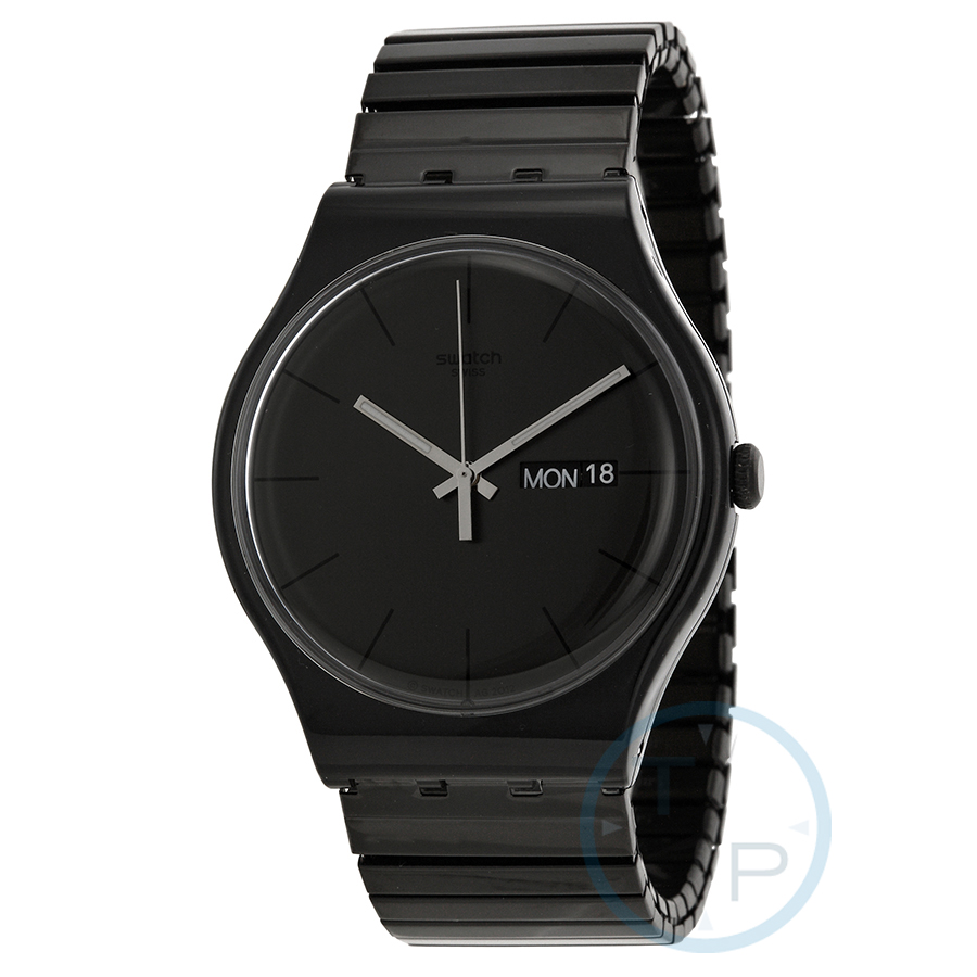 Black plastic case with a black ion-plated stainless steel expansion bracelet. Fixed black plastic bezel. Black dial with luminous grey hands and index hour markers. Dial Type: Analog. Luminescent hands. Day of the week and date display at the 3 o'clock position. Quartz movement. Scratch resistant mineral crystal. Pull / push crown. Solid case back. Case diameter: 41 mm. Case thickness: 11 mm. Round case shape. Band width: 20 mm. Water resistant at 30 meters / 100 feet. Casual watch style. Swatch Mystery Life Black Dial Black Ion-plated Expansion Unisex Watch SUOB708B.