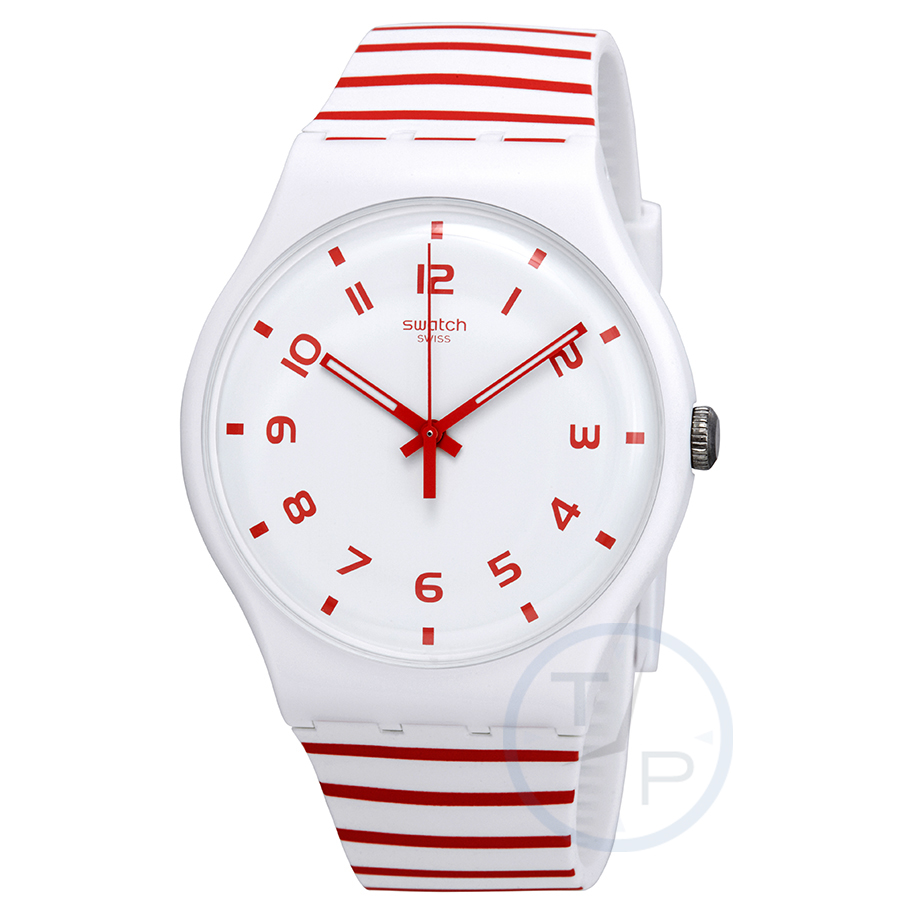 White plastic case with a white and red silicone strap. Fixed white plastic bezel. White dial with luminous red hands and Arabic numeral hour markers. Dial Type: Analog. Luminescent hands. Quartz movement. Plexiglass crystal. Pull / push crown. Solid case back. Round case shape. Case size: 41 mm. Case thickness: 9.85 mm. Band width: 19.7 mm. Band length: 8 inches. Tang clasp. Water resistant at 30 meters / 100 feet. Functions: hour, minute, second. Casual watch style. Swatch Redure White Dial Mens Watch SUOW150.