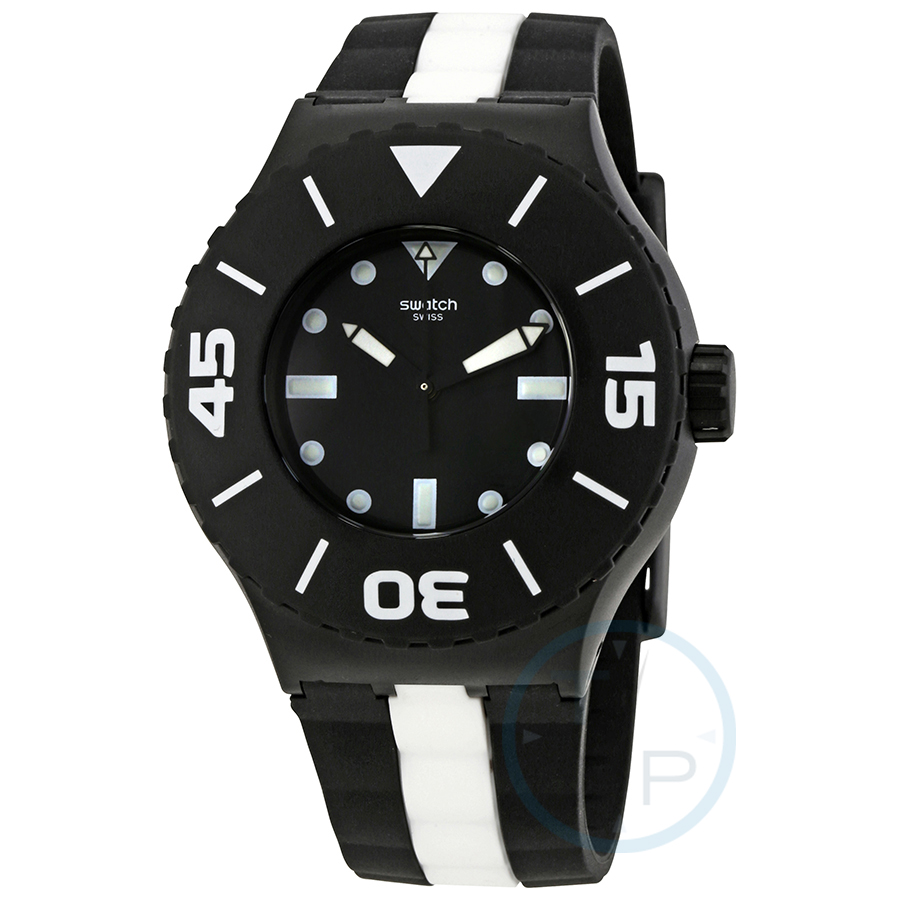 Black plastic case with a black and white silicone strap. Uni-directional rotating black plastic bezel. Black dial with luminous black hands and dot hour markers. Minute markers around the outer rim. Dial Type: Analog. Luminescent hands and markers. Quartz movement. Plexiglass crystal. Pull / push crown. Solid case back. Round case shape. Case size: 44 mm. Case thickness: 16.65 mm. Band width: 22 mm. Tang clasp. Water resistant at 200 meters / 660 feet. Functions: hour, minute, second. Sport watch style. Swatch Scuba Libre Black Dial Sports Mens Watch SUUB102.