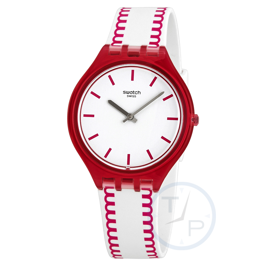 Translucent pink plastic case with a white and pink silicone strap. Fixed translucent pink plastic bezel. White dial with grey hands and index hour markers. Dial Type: Analog. Quartz movement. Pull / push crown. Plexiglass crystal. Solid case back. Round case shape. Case size: 36.80 mm. Case thickness: 5.40 mm. Band width: 17.6 mm. Tang clasp. Water resistant at 30 meters / 100 feet. Functions: hour, minute. Casual watch style. Swatch Skinpunch White Dial Ladies Watch SVOP102.