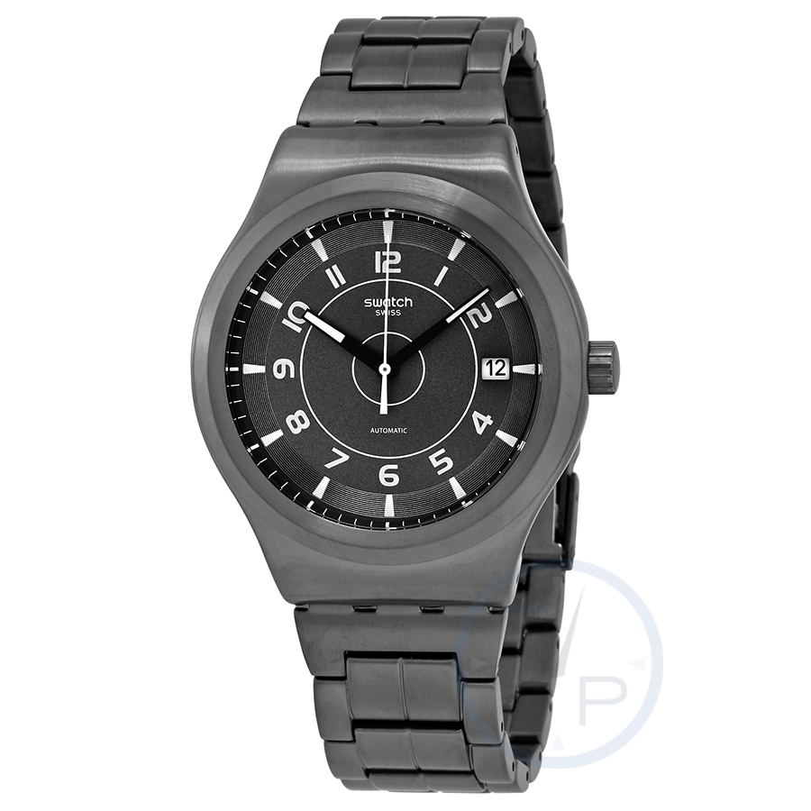 Gunmetal PVD stainless steel case with a gunmetal PVD stainless steel bracelet. Fixed gunmetal PVD stainless steel bezel. Gunmetal dial with luminous black hands and Arabic numeral / index hour markers. Minute markers around the outer rim. Dial Type: Analog. Luminescent hands and markers. Date display at the 3 o'clock position. Automatic movement. Scratch resistant mineral crystal. Pull / push crown. Transparent case back. Round case shape, case size: 42 mm, case thickness: 13.80 mm. Band width: 19.6 mm, band length: 8.35 inches. Fold over with safety release clasp. Water resistant at 30 meters / 100 feet. Functions: date, hour, minute, second. Casual watch style. Swatch Sistem Brushed Automatic Mens Watch YIM400G.