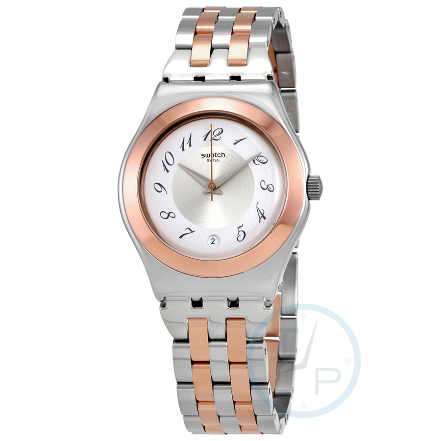 Rose gold-tone stainless steel case with a two-tone (silver-tone and rose gold-tone) stainless steel bracelet. Fixed rose gold-tone stainless steel bezel. Silver dial with silver-tone hands and Arabic numeral hour markers. Dial Type: Analog. Date display at the 6 o'clock position. Quartz movement. Scratch resistant plexiglass crystal. Pull / push crown. Solid case back. Round case shape, case size: 33 mm, case thickness: 9 mm. Band width: 18 mm. Jewelry clasp. Water resistant at 30 meters / 100 feet. Functions: date, hour, minute, second. Casual watch style. Swatch Midimix Silver Dial Ladies Watch YLS454G.