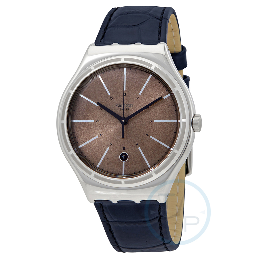 Silver-tone stainless steel case with a blue leather strap. Fixed silver-tone stainless steel bezel. Grey dial with black hands and index / Arabic numeral hour markers. Minute markers around the outer rim. Dial Type: Analog. Date display at the 6 o'clock position. Quartz movement. Scratch resistant mineral crystal. Pull / push crown. Solid case back. Round case shape, case size: 42.70 mm, case thickness: 11.70 mm. Band width: 19 mm. Tang clasp. Water resistant at 30 meters / 100 feet. Functions: date, hour, minute, second. Casual watch style. Swatch Eppendorf Grey Dial Mens Watch YWS415.