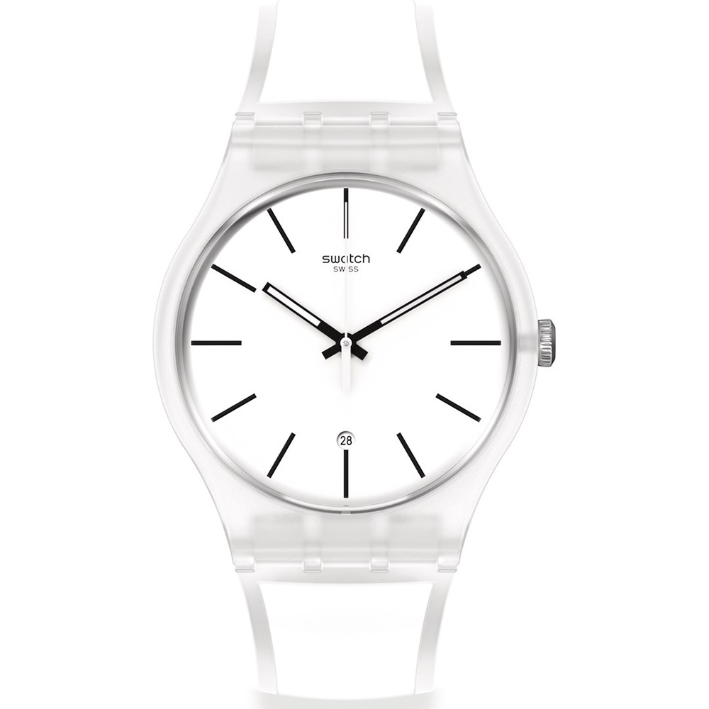 Transparent bio-sourced case with a transparent silicone strap with a white center. Fixed transparent bio-sourced bezel. White dial with luminous black hands and index hour markers. Dial Type: Analog. Date display above the 6 o'clock position. Quartz movement. Plexiglass crystal. Pull / push crown. Solid case back. Round case shape. Case size: 41 mm. Case thickness: 9.85 mm. Tang clasp. Water resistant at 30 meters / 100 feet. Functions: date, hour, minute, second. White Trip Series. Casual watch style. Watch label: Swiss Made. Swatch White Trip Quartz White Dial Mens Watch SO29K401.