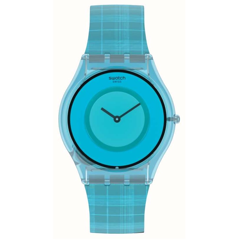 Blue (translucent) bio-sourced material case with a blue silicone strap. Fixed blue (translucent) bio-sourced material bezel. Blue dial with black hands. No markers. Dial Type: Analog. Quartz movement. Pull / push crown. Solid case back. Round case shape. Case size: 34 mm. Case thickness: 5.4 mm. Band width: 17.6 mm. Tang clasp. Water resistant at 30 meters / 100 feet. Functions: hour, minute. Swatch X Supriya Lele Series. Casual watch style. Swatch X Supriya Lele Quartz Blue Dial Ladies Watch SS08Z102.