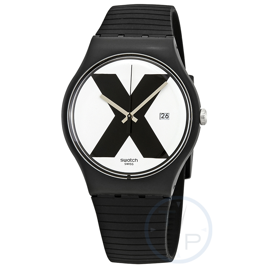 Black plastic case with a black silicone strap. Fixed black plastic bezel. White dial with silver-tone hands. No markers. Dial Type: Analog. Date display at the 3 o'clock position. Quartz movement. Plexiglass crystal. Pull / push crown. Solid case back. Round case shape. Case size: 41 mm. Case thickness: 9.85 mm. Band width: 20 mm. Tang clasp. Water resistant at 30 meters / 100 feet. Functions: date, hour, minute, second. Casual watch style. Swatch XX-Rated Black White Dial Black Silicone Mens Watch SUOB402.
