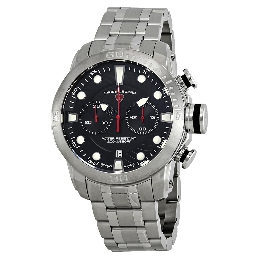 Stainless steel case with a stainless steel bracelet. Stainless steel bezel. Black dial with luminous black hands and dot hour markers. Minute markers around the outer rim. Dial Type: Analog. Luminescent hands and markers. Date display at the 6 o'clock position. Chronograph - two sub-dials displaying: 60 second and 30 minute. ISA caliber 8371/2010 quartz movement. Scratch resistant Sapphitek crystal. Screw down crown. Solid case back. Round case shape. Case size: 50 mm. Case thickness: 16 mm. Band width: 24 mm. Deployment clasp with a push button release. Water resistant at 200 meters / 660 feet. Functions: chronograph, date, hour, minute, second. Seagate Series. Dive watch style. Watch label: Swiss Made. Swiss Legend Seagate Chronograph Black Dial Mens Watch SL-10624SM-11.