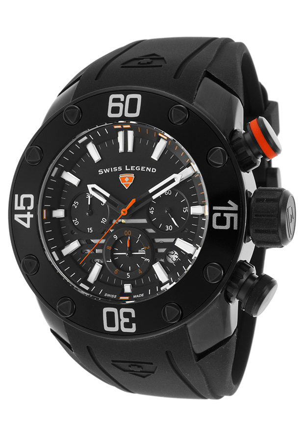Black ion-plated stainless steel case with a black silicone strap. Fixed black ion-plated bezel. Black dial with luminous black and white hands and index hour markers. Minute markers around the outer rim. Dial Type: Analog. Luminescent hands and indices. Date display between the 4 and 5 o'clock positions. Chronograph - three sub-dials displaying: 60 second, 30 minute and 1/10th of a second. Caliber 8371/2220/6000 quartz movement. Scratch resistant Sapphitek crystal. Screw down crown. Screw-down stainless steel case back. Case size: 50 mm. Case thickness: 16 mm. Round case shape. Band width: 24 mm. Band length: 8.5 inches. Tang clasp. Water resistant at 200 meters / 660 feet. Functions: chronograph, date, hour, minute, second. Sport watch style. Watch label: Swiss Made. Swiss Legend Lionpulse Chronograph Mens Watch 10616SM-BB-01-OA.