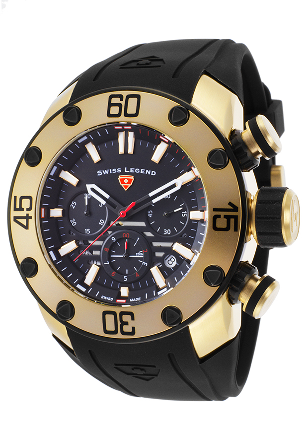 Yellow gold-plated stainless steel case with a black silicone strap. Fixed yellow gold-plated bezel. Black dial with black skeleton hands and index hour markers. Minute markers around the outer rim. Dial Type: Analog. Luminescent hands and indices. Date display between the 4 and 5 o'clock positions. Chronograph - three sub-dials displaying: 60 second, 30 minute and 1/10th of a second. ISA caliber 8371/2220/6000 quartz movement. Scratch resistant Sapphitek crystal. Screw down crown. Screw down stainless steel case back. Round case shape. Case size: 50 mm. Case thickness: 16 mm. Band width: 24 mm. Band length: 8.5 inches. Tang clasp. Water resistant at 200 meters / 660 feet. Functions: chronograph, date, hour, minute, second. Lionpulse Series. Sport watch style. Watch label: Swiss Made. Swiss Legend Lionpulse Chronograph Mens Watch 10616SM-YG-01-BB.