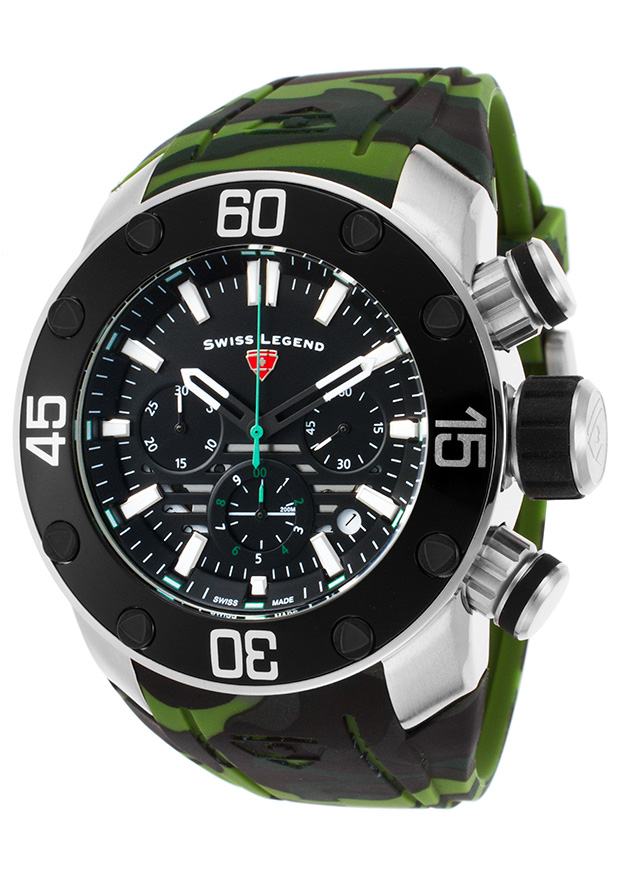Stainless steel case with a green camo silicone strap. Fixed black aluminum bezel. Black dial with black and white skeleton hands and index hour markers. Minute markers around the outer rim. Dial Type: Analog. Luminescent hands and indices. Date display between the 4 and 5 o'clock positions. Chronograph - three sub-dials displaying: 60 second, 30 minute and 1/10th of a second. ISA caliber 8371/2320 quartz movement. Scratch resistant sapphitek crystal. Screw down crown. Solid case back. Case size: 51 mm. Case thickness: 16 mm. Round case shape. Band width: 24 mm. Band length: 8.75 inches. Tang clasp. Water resistant at 200 meters / 660 feet. Functions: chronograph, date, hour, minute, second. Sport watch style. Watch label: Swiss Made. Swiss Legend Lionpulse Chronograph Mens Watch 10617SM-01-GRNS.