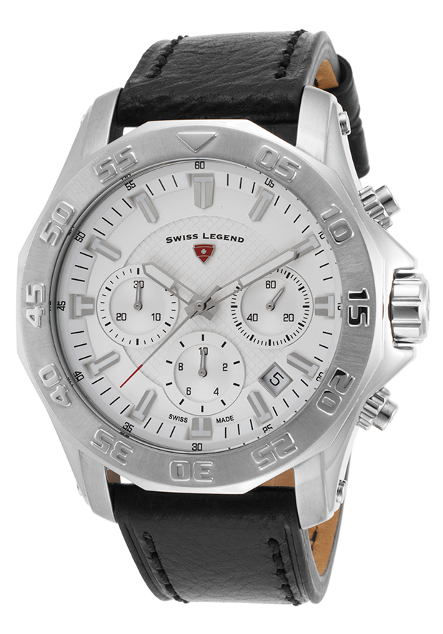 Stainless steel case with a black leather strap. Fixed stainless steel bezel. White dial with luminous silver-tone hands and index hour markers. Minute markers around the outer rim. Dial Type: Analog. Luminescent hands and indices. Date display between the 4 and 5 o'clock positions. Chronograph - three sub-dials displaying: 60 second, 30 minute and 10 hour. ISA caliber 8371/2220 quartz movement. Scratch resistant Sapphitek crystal. Screw down crown. Screw down stainless steel case back. Case size: 48 mm. Case thickness: 14 mm. Dodecagon case shape. Band width: 23 mm. Band length: 8.5 inches. Deployment clasp with a push button release. Water resistant at 200 meters / 660 feet. Functions: chronograph, date, hour, minute, second. Dress watch style. Watch label: Swiss Made. Swiss Legend Islander Chronograph Mens Watch 16198SM-02S.