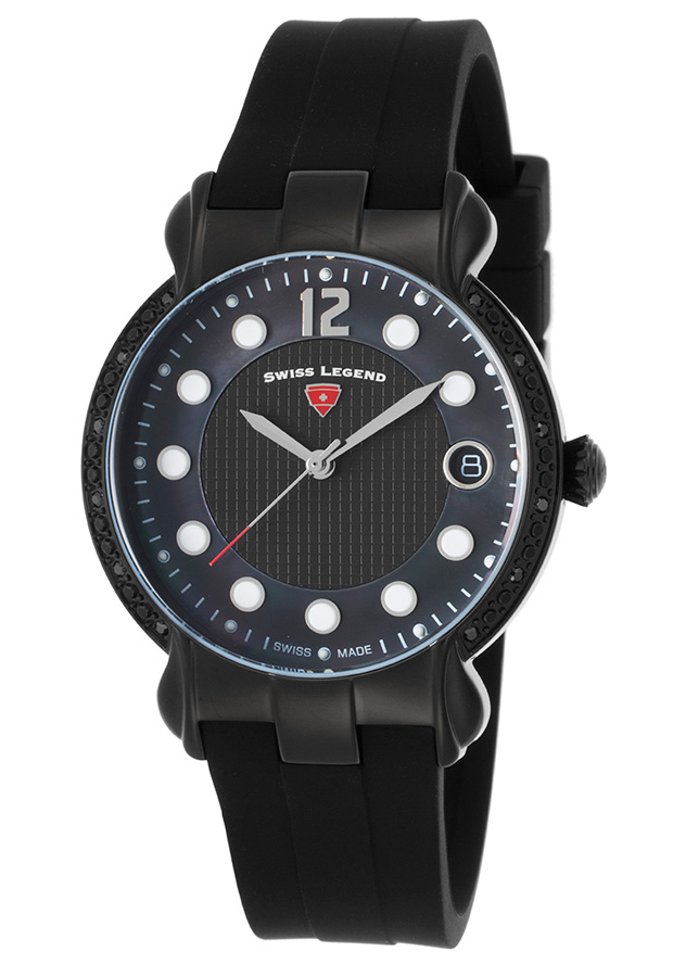 Black ion-plated stainless steel case with a black silicone strap. Fixed black ion-plated bezel set with 12 diamonds. Black mother of pearl dial with silver-tone hands and dot hour markers. An Arabic numeral appears at the 12 o'clock position. Minute markers around the outer rim. Dial Type: Analog. Luminescent markers. Date display at the 3 o'clock position. ISA Caliber 2331/110 quartz movement. Scratch resistant Sapphitek crystal. Pull / push crown. Screw down stainless steel case back. Case size: 35 mm. Case thickness: 10 mm. Round case shape. Band width: 16 mm. Band length: 7.75 inches. Tang clasp. Water resistant at 100 meters / 330 feet. Functions: date, hour, minute, second. Additional Info: in general, suitable for swimming and snorkeling, but not diving. Sport watch style. Watch label: Swiss Made. Swiss Legend Layla Ladies Watch 16591SM-BB-01.