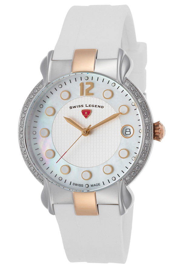Stainless steel case with a white silicone strap. Fixed stainless steel bezel set with 12 diamonds. White mother of pearl dial with rose gold-tone hands and dot hour markers. An Arabic numeral appears at the 12 o'clock position. Minute markers around the outer rim. Dial Type: Analog. Luminescent markers. Date display at the 3 o'clock position. ISA caliber 2331/110 quartz movement. Scratch resistant Sapphitek crystal. Pull / push crown. Screw down stainless steel case back. Case size: 35 mm. Case thickness: 10 mm. Round case shape. Band width: 16 mm. Band length: 7.75 inches. Tang clasp. Water resistant at 100 meters / 330 feet. Functions: date, hour, minute, second. Sport watch style. Watch label: Swiss Made. Swiss Legend Layla Ladies Watch 16591SM-SR-02-WHT.