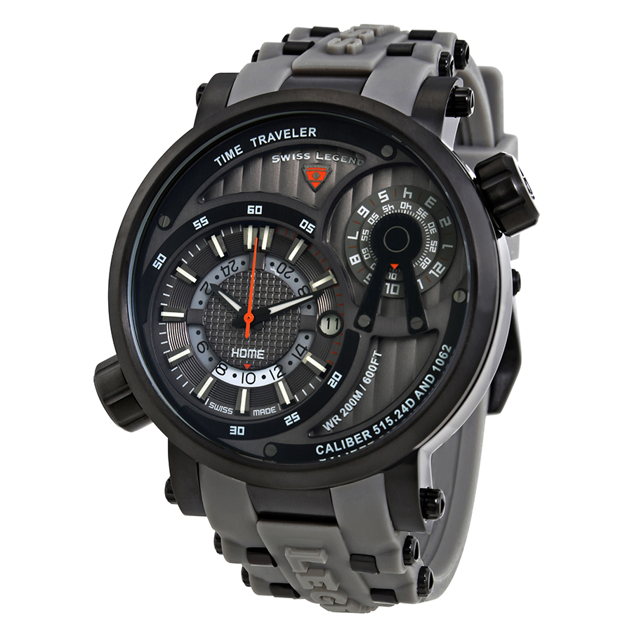 Black ion-plated stainless steel case with a grey silicone strap with black ion-plated stainless steel barrel inserts. Fixed black ion-plated bezel. Grey dial with luminous black hands and index hour markers. Minute markers. Dial Type: Analog. Luminescent hands and markers. Date display at the 6 o'clock position. Dual time sub-dial at the 2 o'clock positions. Ronda 515.24H&1062 quartz movement. Scratch resistant Sapphitek crystal. Screw down crown. Solid case back. Case size: 50 mm. Case thickness: 13 mm. Round case shape. Band width: 22 mm. Band length: 8.75 inches. Tang clasp. Water resistant at 200 meters / 660 feet. Functions: date, day, hour, minute, second. Casual watch style. Watch label: Swiss Made. Swiss Legend Time Traveler Mens Watch SL-13841SM-BB-014-GRYS.