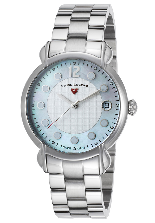Stainless steel case with a stainless steel bracelet. Fixed stainless steel bezel. White mother of pearl dial with silver-tone hands and dot hour markers. An Arabic numeral appears at the 12 o'clock position. Minute markers around the outer rim. Dial Type: Analog. Luminescent hands and markers. Date display at the 3 o'clock position. Quartz movement. Scratch resistant Sapphitek crystal. Pull / push crown. Screw down stainless steel case back. Round case shape. Case size: 35 mm. Case thickness: 10 mm. Band width: 17 mm. Band length: 7.25 inches. Fold over clasp. Water resistant at 100 meters / 330 feet. Functions: date, hour, minute, second. Additional Info: in general, suitable for swimming and snorkeling, but not scuba diving. Casual watch style. Watch label: Swiss Made. Swiss Legend Layla White Mother of Pearl Dial Ladies Watch SL-16592SM-02.