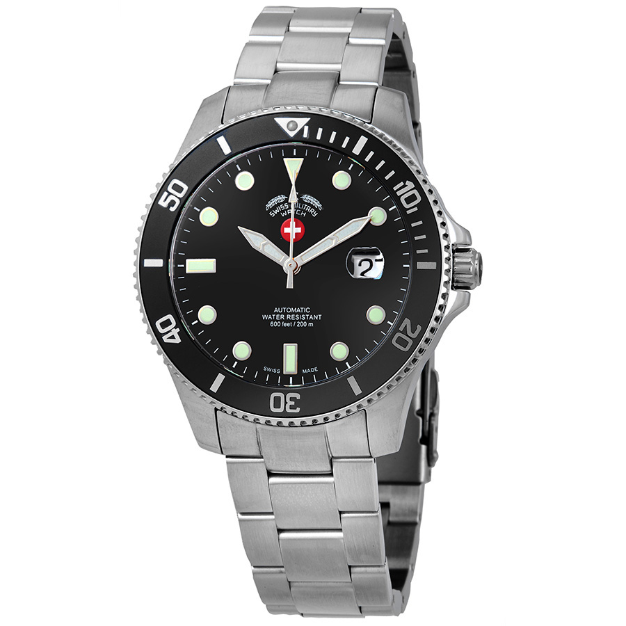 Silver-tone stainless steel case with a silver-tone stainless steel bracelet. Black stainless steel bezel. Black dial with silver-tone hands and dot hour markers. Minute markers around the outer rim. Dial Type: Analog. Date display at the 3 o'clock position. ETA Caliber 2824 automatic movement with a 38-hour power reserve. Scratch resistant sapphire crystal. Screw-down crown. Round case shape. Case size: 42 mm. Band width: 20 mm. Water resistant at 200 meters / 660 feet. Functions: date, hour, minute, second. Casual watch style. Watch label: Swiss Made. Swiss Military Invincible Automatic Black Dial Mens Watch 3006.