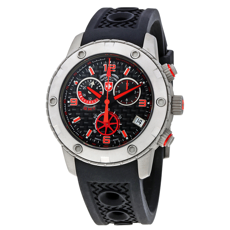 Mens Swiss Military Watch GMT chronograph RALLYE GMT, ETA cal. G10.962 Swiss Made quartz mvt., 4 jewels, black dial, sandblasted stainless steel case, screw-down crown, sapphire crystal, silicone strap (length 225mm, width 22mm, thickness 4mm; pin buckle). Case: diameter 44mm, thickness 13mm, 20atm water resistant. Weight: 118gr. HS Code: 9102.110.125