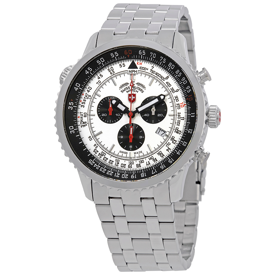 Silver-tone stainless steel case with a silver-tone stainless steel bracelet. Fixed silver-tone stainless steel bezel. White dial with luminous black hands and index hour markers. Minute markers. tachymeter markings. conversion scale around the outer rim. Dial Type: Analog. Luminescent hands. Date display at the 4 o'clock position. Chronograph - three sub-dials displaying: 60 second, 30 minute and 12 hours. Quartz movement. Scratch resistant sapphire crystal. Screw down crown. Solid case back. Round case shape. Case size: 46 mm. Deployment clasp. Water resistant at 200 meters / 660 feet. Functions: chronograph, tachymeter, date, hour, minute, second. Military watch style. Watch label: Swiss Made. Swiss Military Thunderbolt Chronograph White Dial Mens Watch 2950.