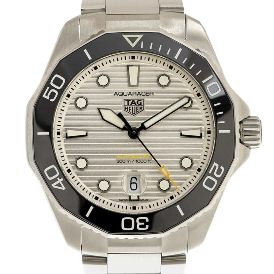 Stainless steel case with a stainless steel bracelet. Uni-directional rotating stainless steel bezel with an inlaid black ceramic ring. Grey dial with luminous black hands and dot hour markers. Minute markers around the outer rim. Dial Type: Analog. Luminescent hands and markers. Date display at the 6 o'clock position. TAG Heuer calibre 5 automatic movement, based upon ETA 2824-2, containing 26 Jewels, bitting at 28800 vph, and has a power reserve of approximately 38 hours. Scratch resistant sapphire crystal. Screw down crown. Solid case back. Round case shape. Case size: 43 mm. Fold over clasp with a safety release. Water resistant at 300 meters / 1000 feet. Functions: date, hour, minute, second. Aquaracer Series. Dive watch style. Watch label: Swiss Made. Tag Heuer Aquaracer Automatic Grey Dial Mens Watch WBP201C.BA0632.