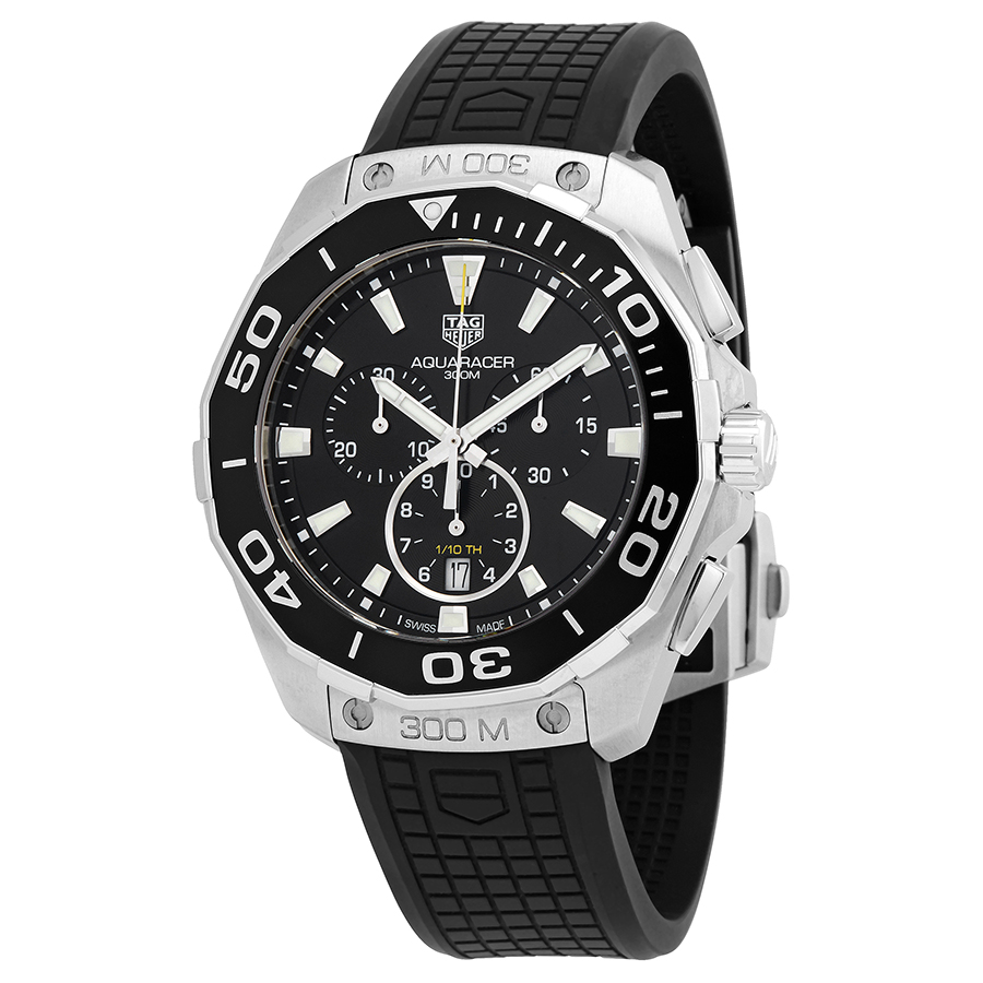 Silver-tone stainless steel case with a black rubber strap. Uni-directional rotating black aluminum bezel. Black dial with silver-tone hands and index hour markers. Minute markers around the outer rim. Dial Type: Analog. Luminescent hands and markers. Date display at the 6 o'clock position. Chronograph - three sub-dials displaying: 60 second, 30 minute and 1/10th of a second. Quartz movement. Scratch resistant sapphire crystal. Screw down crown. Solid case back. Round case shape, case size: 43 mm, case thickness: 15 mm. Band width: 21 mm. Deployment clasp. Water resistant at 300 meters / 1000 feet. Functions: chronograph, date, hour, minute, second. Dive watch style. Watch label: Swiss Made. Tag Heuer Aquaracer Chronograph Quartz Black Dial Mens Watch CAY111A.FT6041.